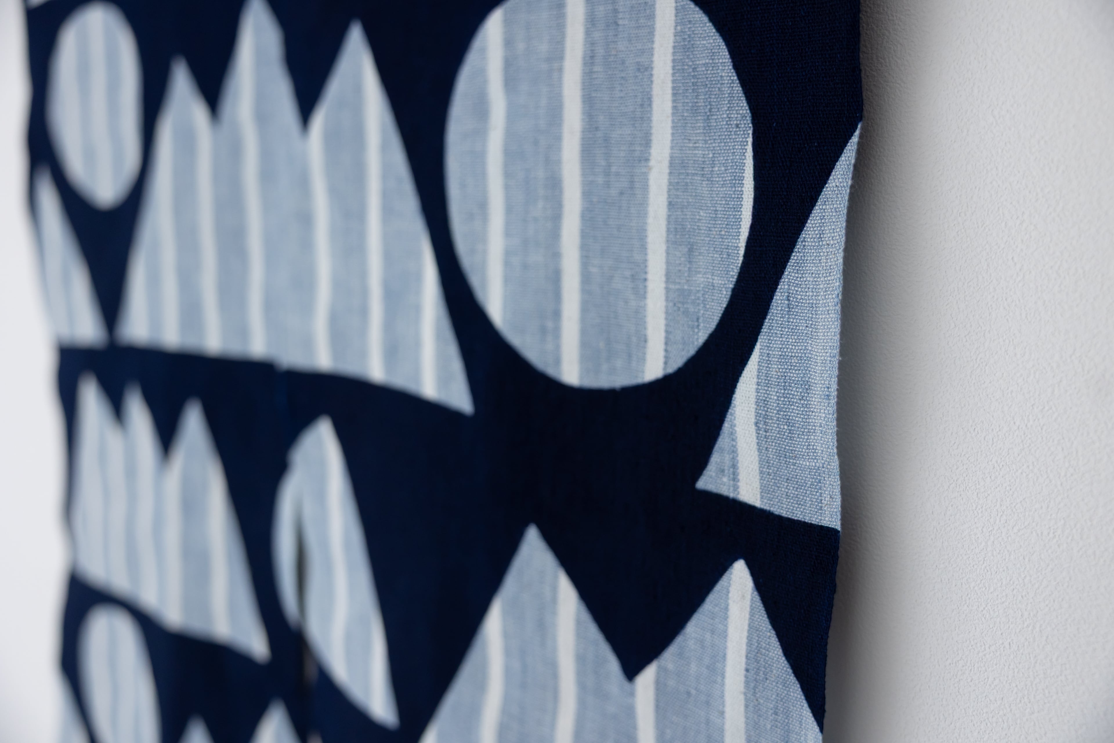 水色と濃紺が美しいコントラストを生み出す「山月日」をモチーフにした暖簾です。山内さんが藍染した糸を使い仕立てたオリジナル太縞布を使用しています。