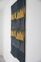 この色合いはとても珍しくインパクトのある一枚です。山と月と太陽が並ぶ洗練されたデザイン、山内武志さんの型染めによる「山月日」