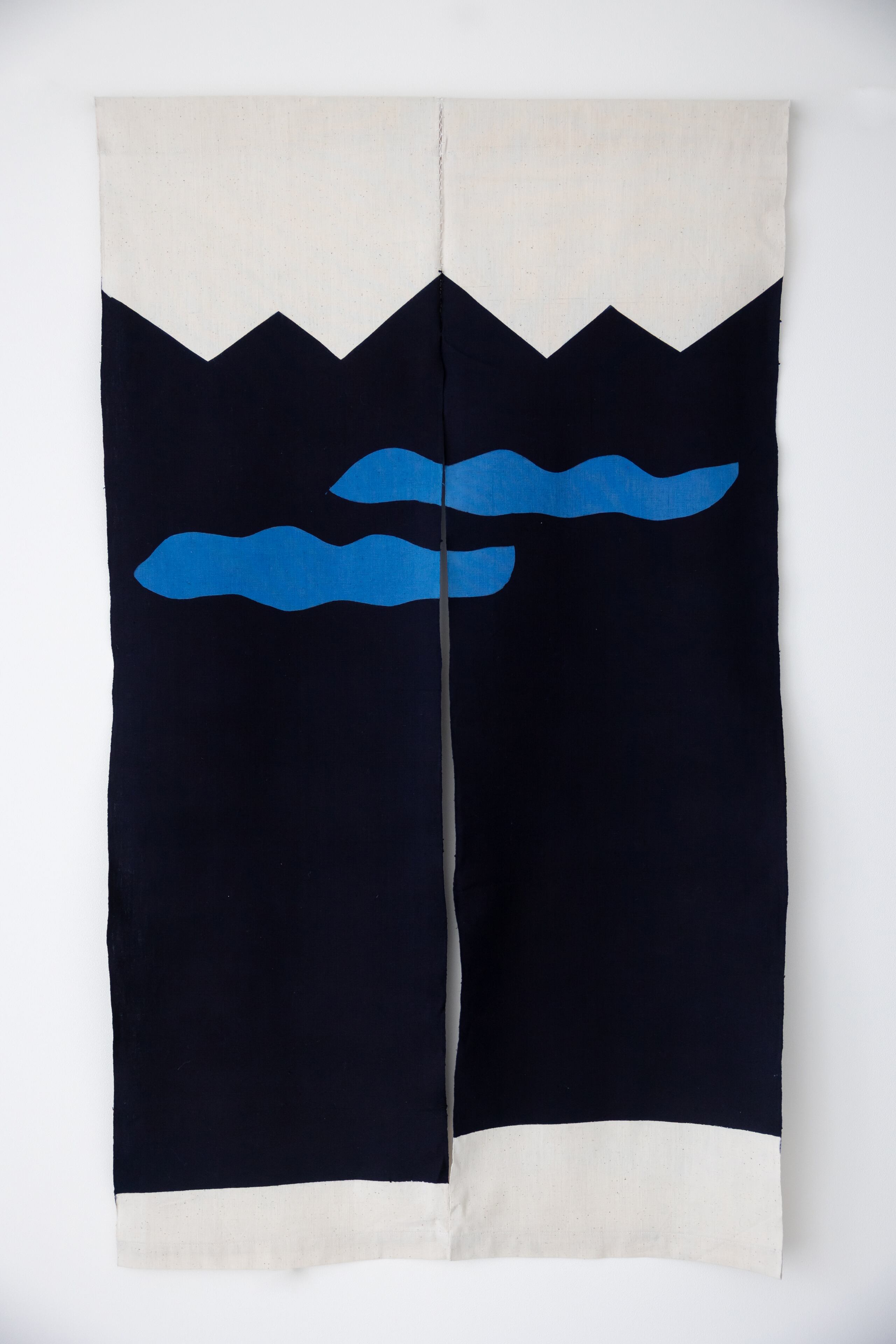 ジグザグ山に鮮やかな青雲が印象的な型染め暖簾です。