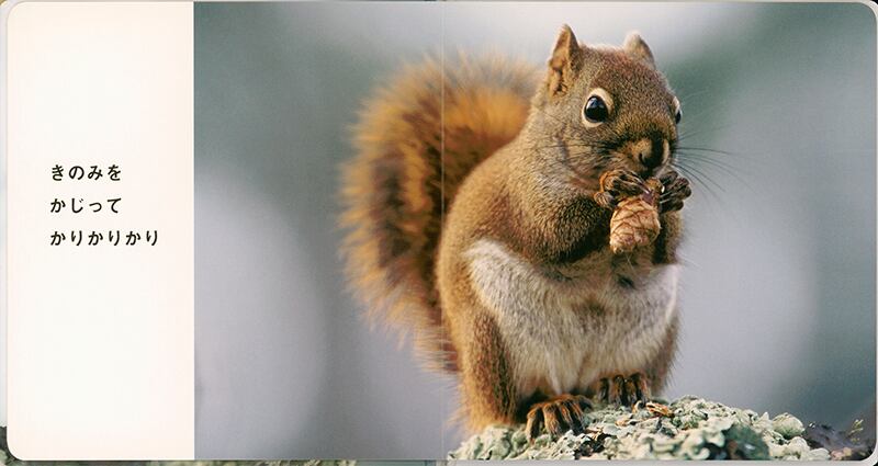 木の実をかじるアカリス、羽をぱっぱっと広げるライチョウ、水草をほおばるヘラジカ、枝の上で眠るミミズク、草の陰から顔をのぞかせた子ジカ。ノースウッズの森に住む野生動物はみな活き活きしています。登場する動物は赤ちゃんにとってはじめて出会うものばかりですが、食べ、遊び、眠る動物たちの様子は私たちの日常の生活と結びつきます。長年撮りためた中から選りすぐりの写真で構成した、赤ちゃんのための写真絵本!