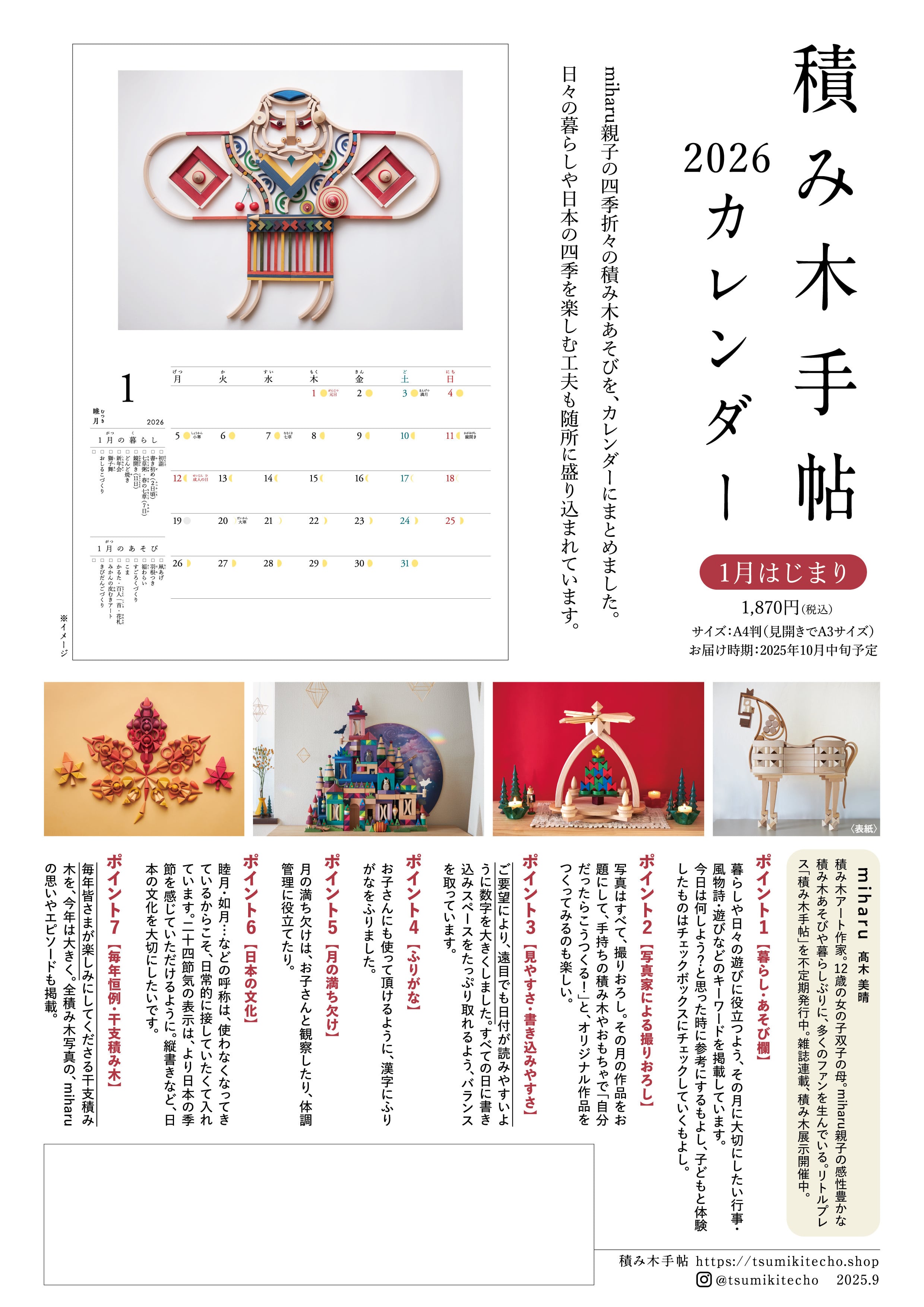 インスタグラムのフォロワーさんのご要望からうまれた、積み木アート作家・miharuさんの2026年版「積み木手帖カレンダー」です。