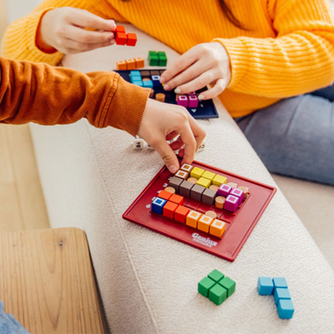 【セット内容】ボード×2、パズルピース×18(9色各2個)、ブロックピース×14、サイコロ×7、遊び方説明書×1