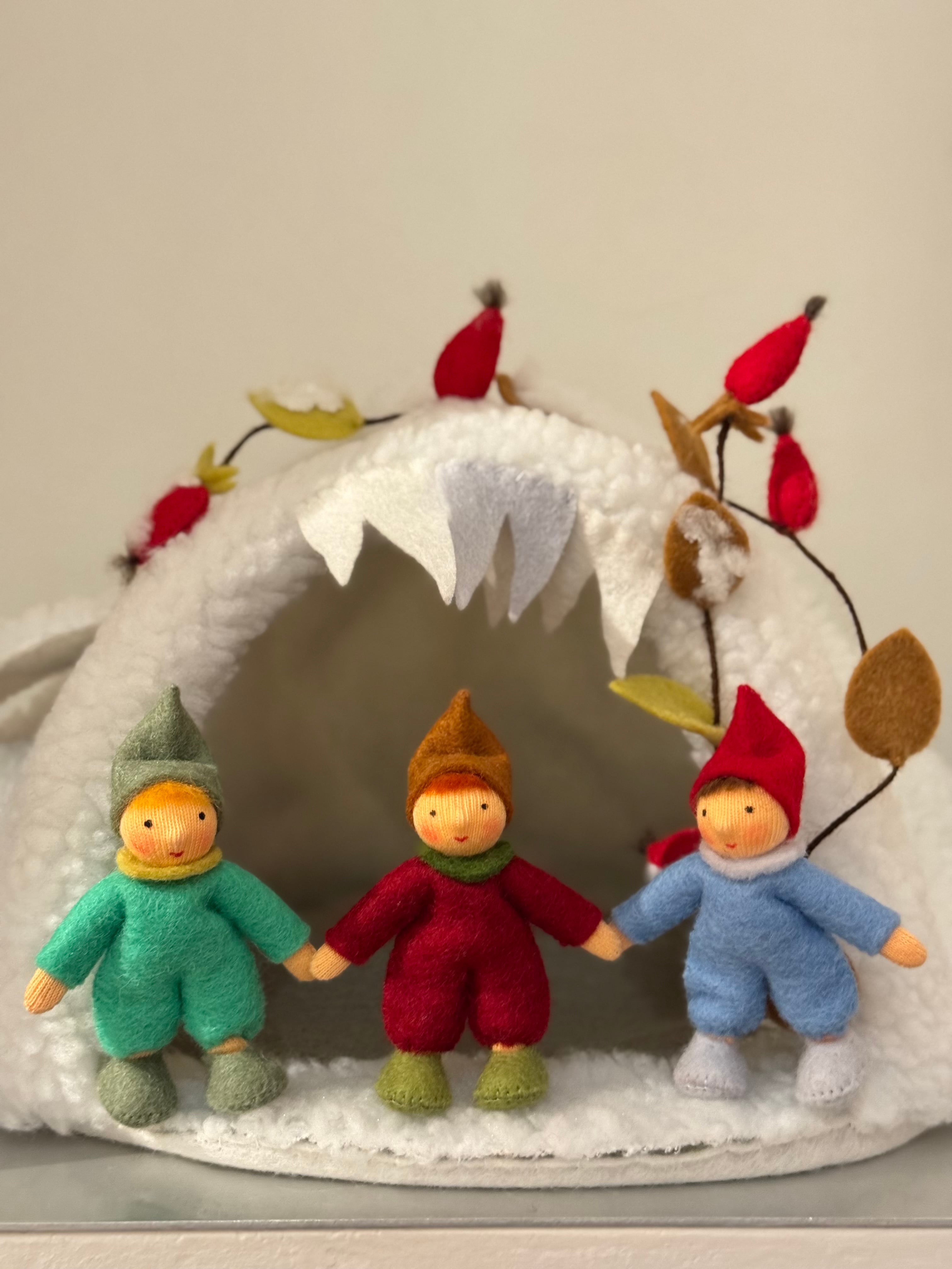 クリスマスはもちろん、冬のお部屋を明るく彩るアンブロシウスドールは、ご家庭で保育園で大活躍。自然物だけでなく、グリムスやグラパットなどの積木やおもちゃと一緒に楽しむのもおすすめです。