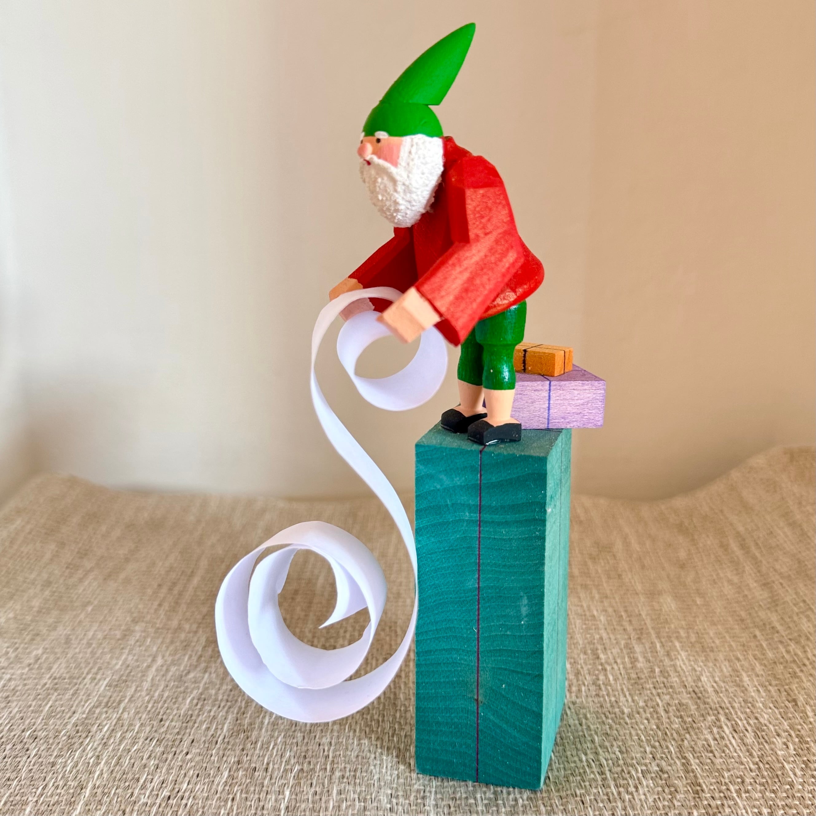 木ままやでも人気のベティーナフランケ工房 24人の小人アドベントシリーズ くるくる巻いたなが〜いリストを見ている小人です H15cm