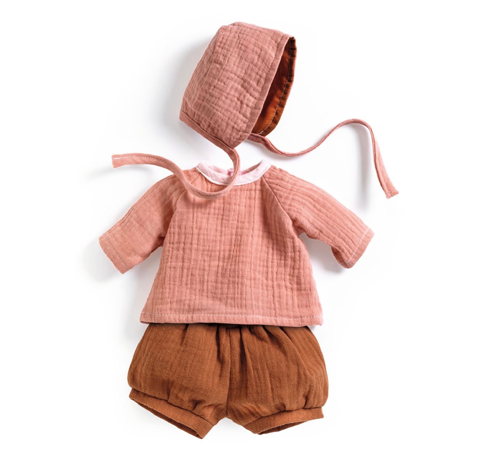 コットン100%のダブルガーゼ生地で、ハーフパンツ、半袖シャツ、ボンネットのセットです。