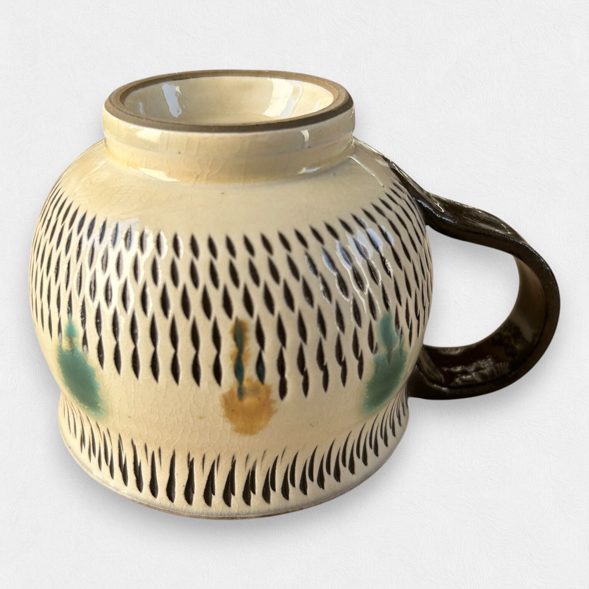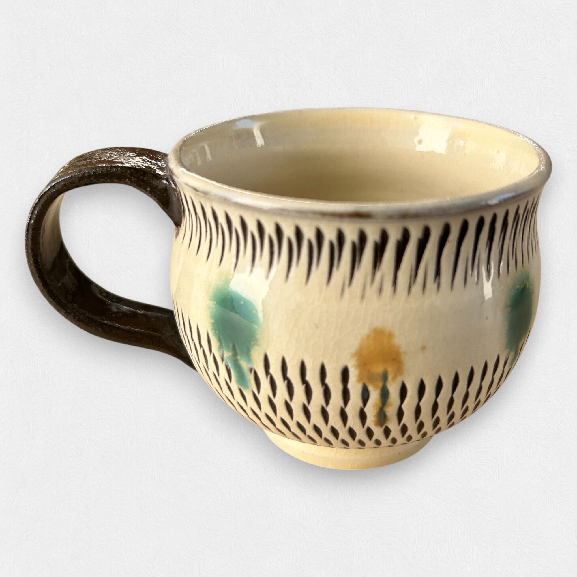 小鹿田焼の特徴である飛び鉋に加え、ドット模様がアクセントになってます。