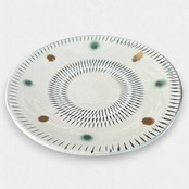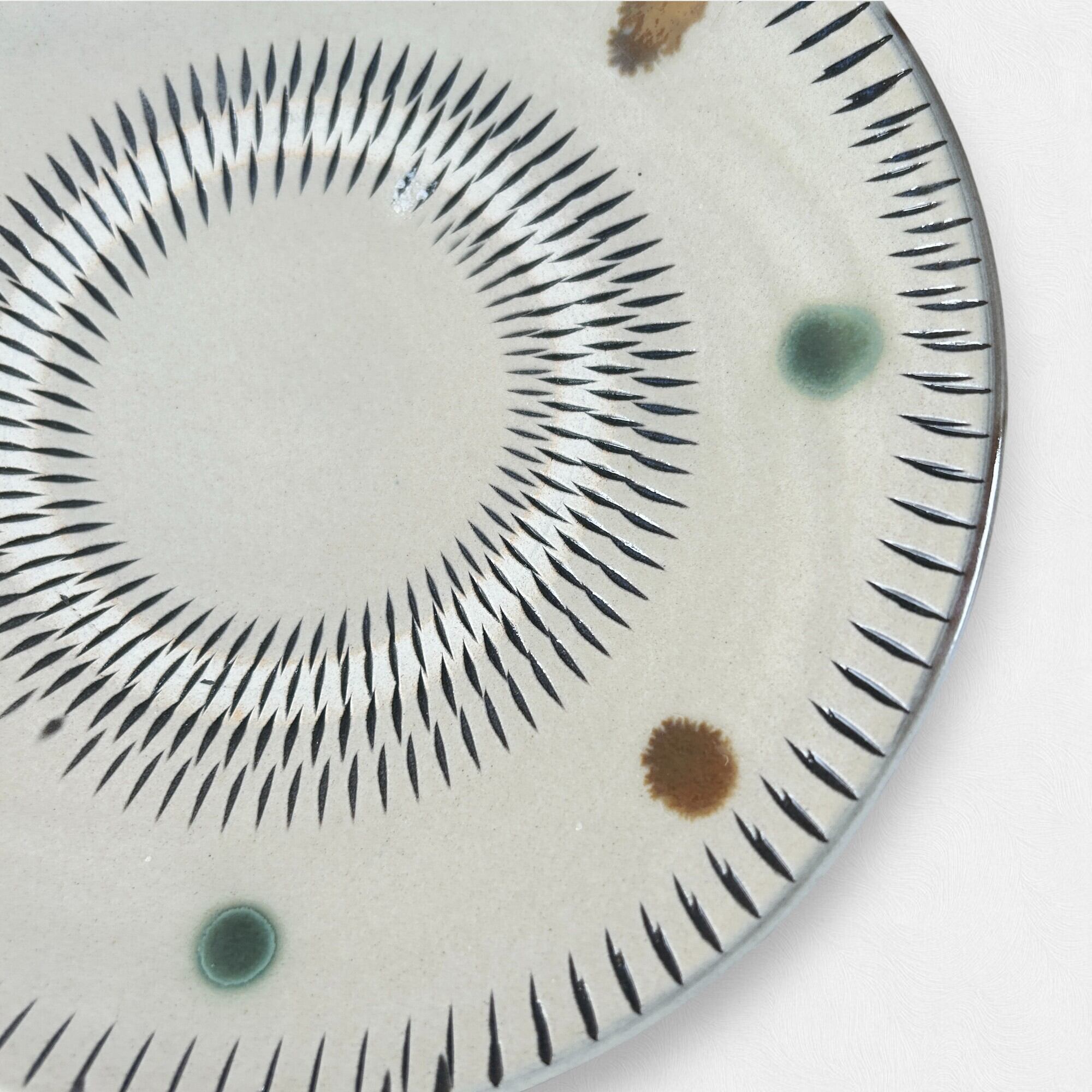小鹿田焼の特徴である飛び鉋とドット模様が合わさった平皿です。