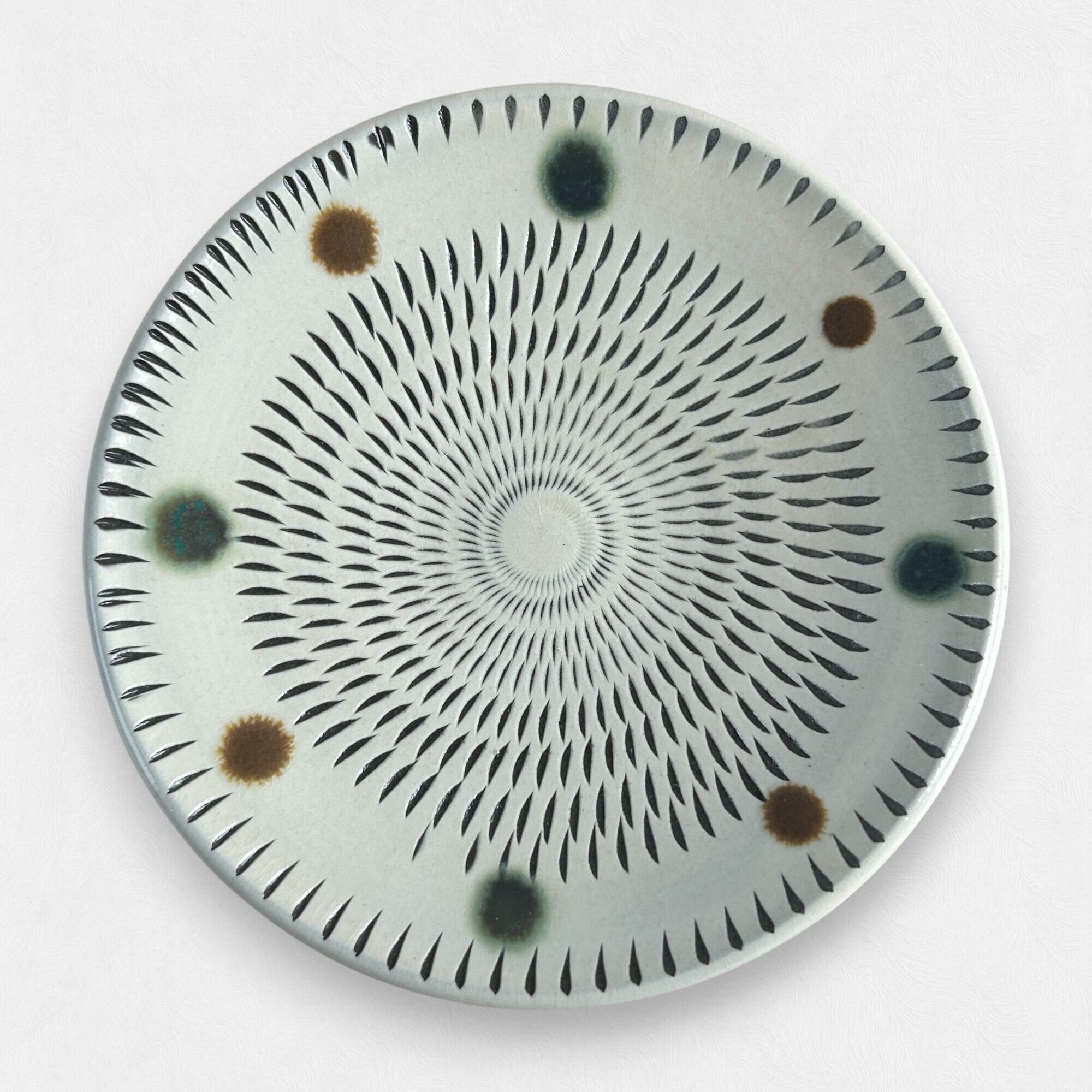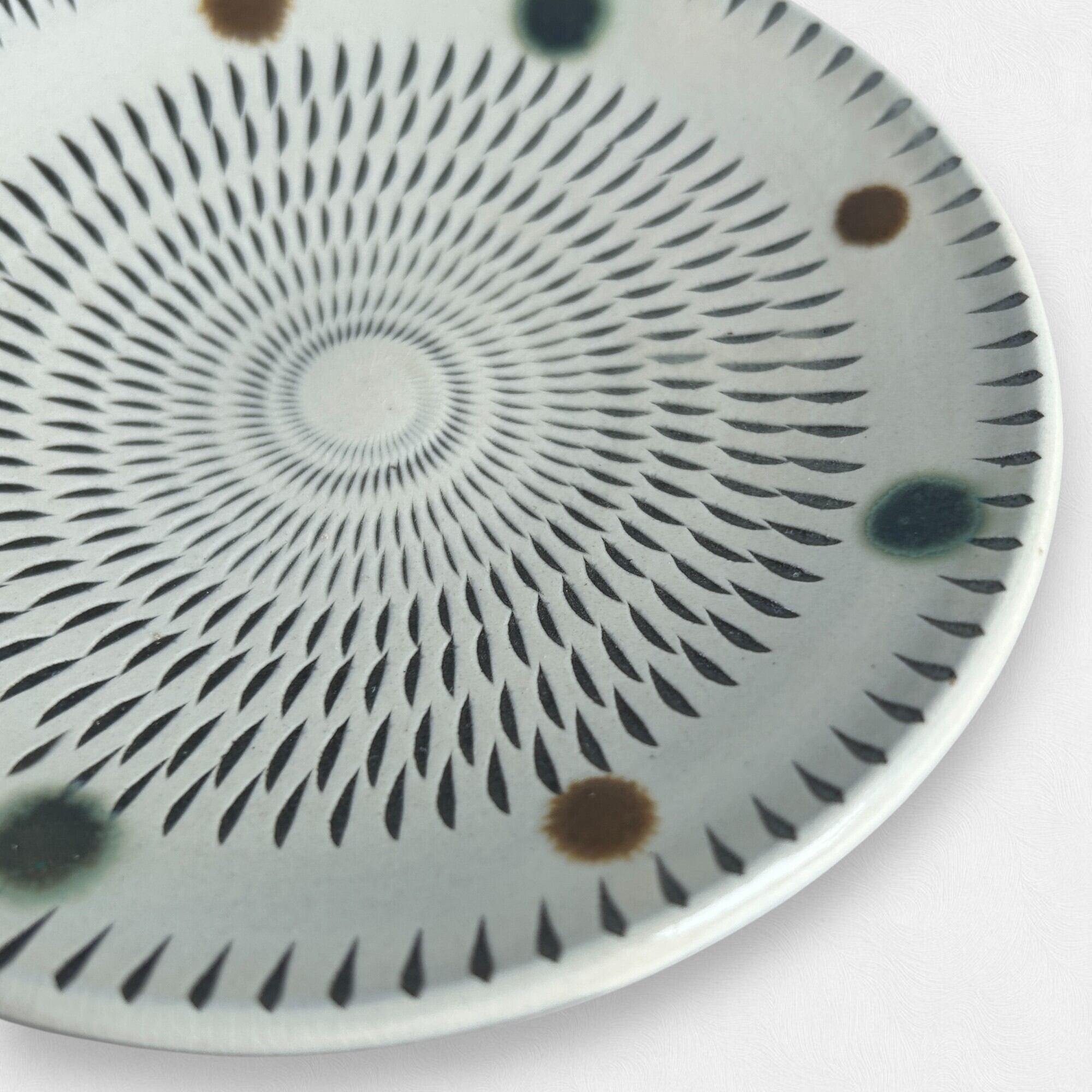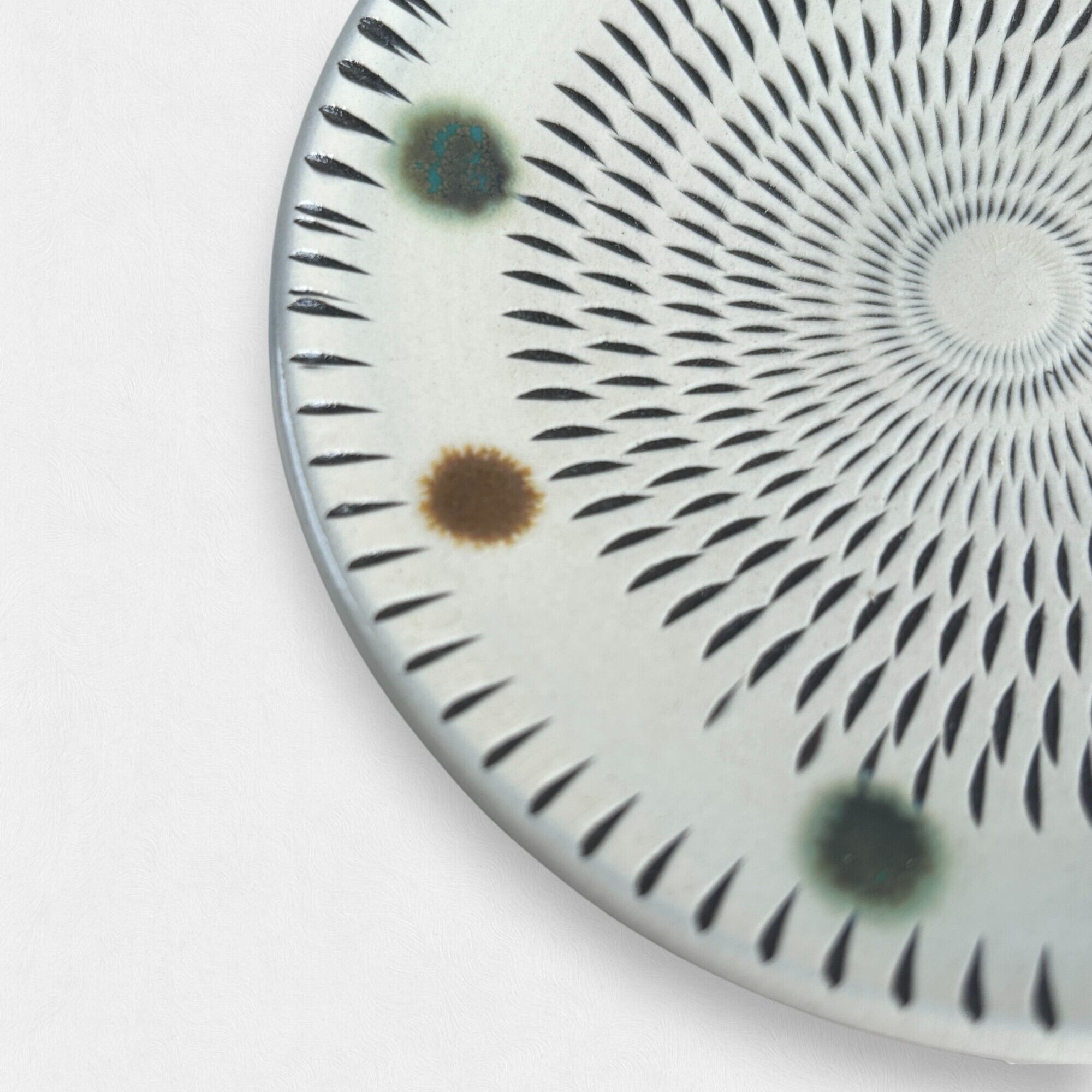 小鹿田焼の多くは窯に入れる際、何枚か重ねて焼くため真ん中に「蛇の目」という輪が残りますが、こちらは一番上で焼かれている「目なし」です。