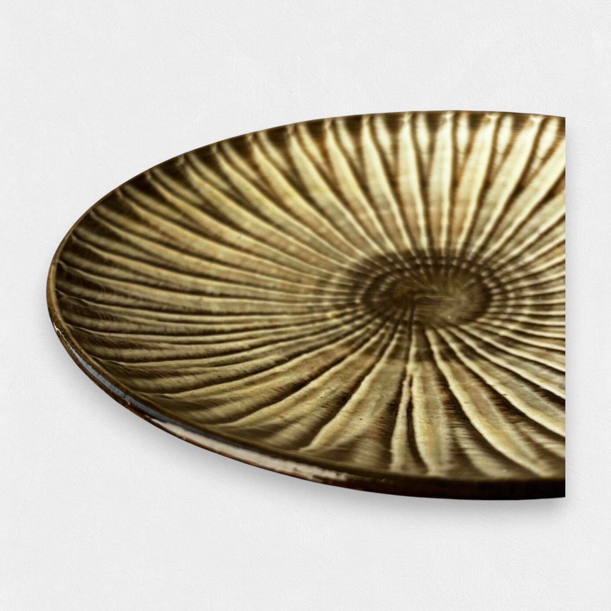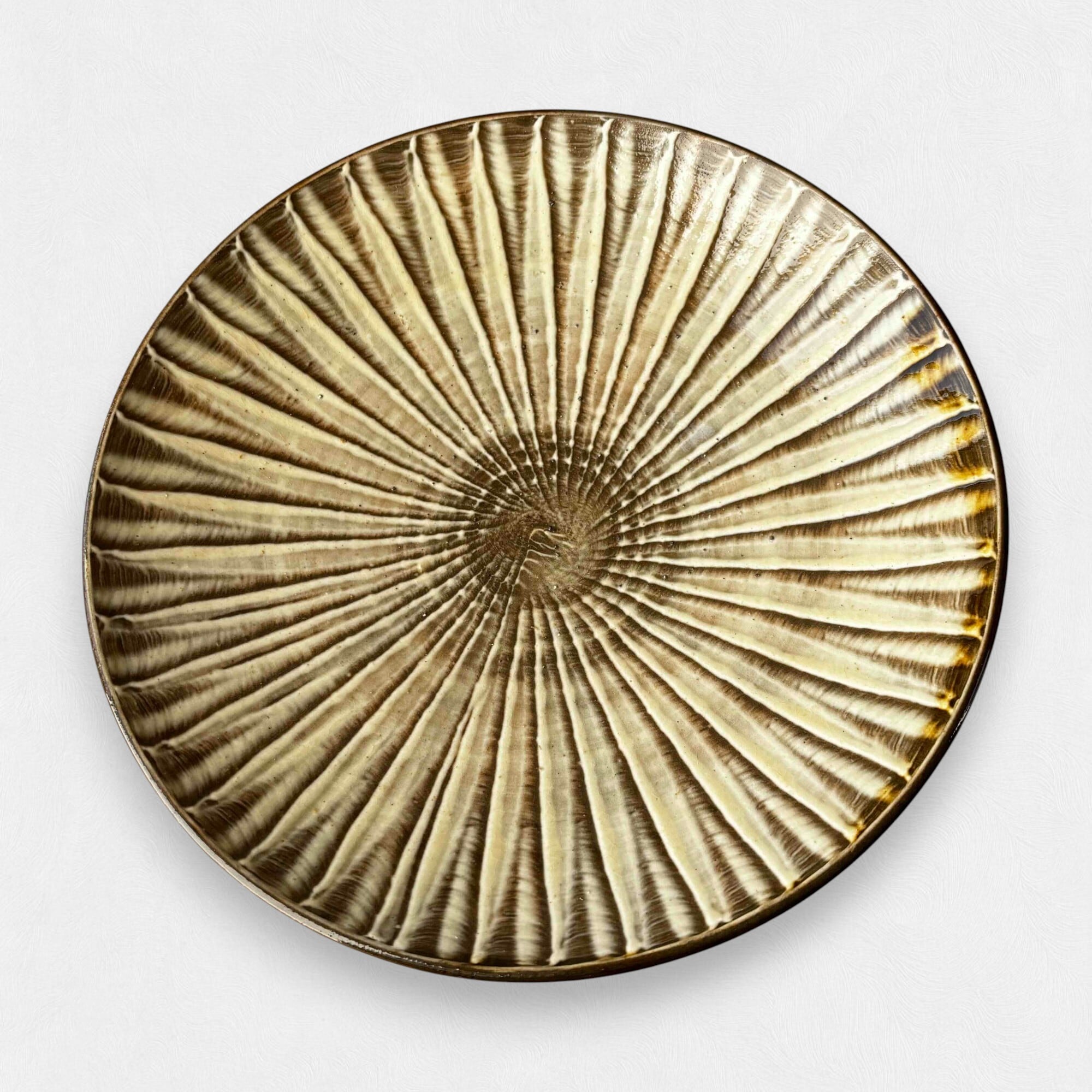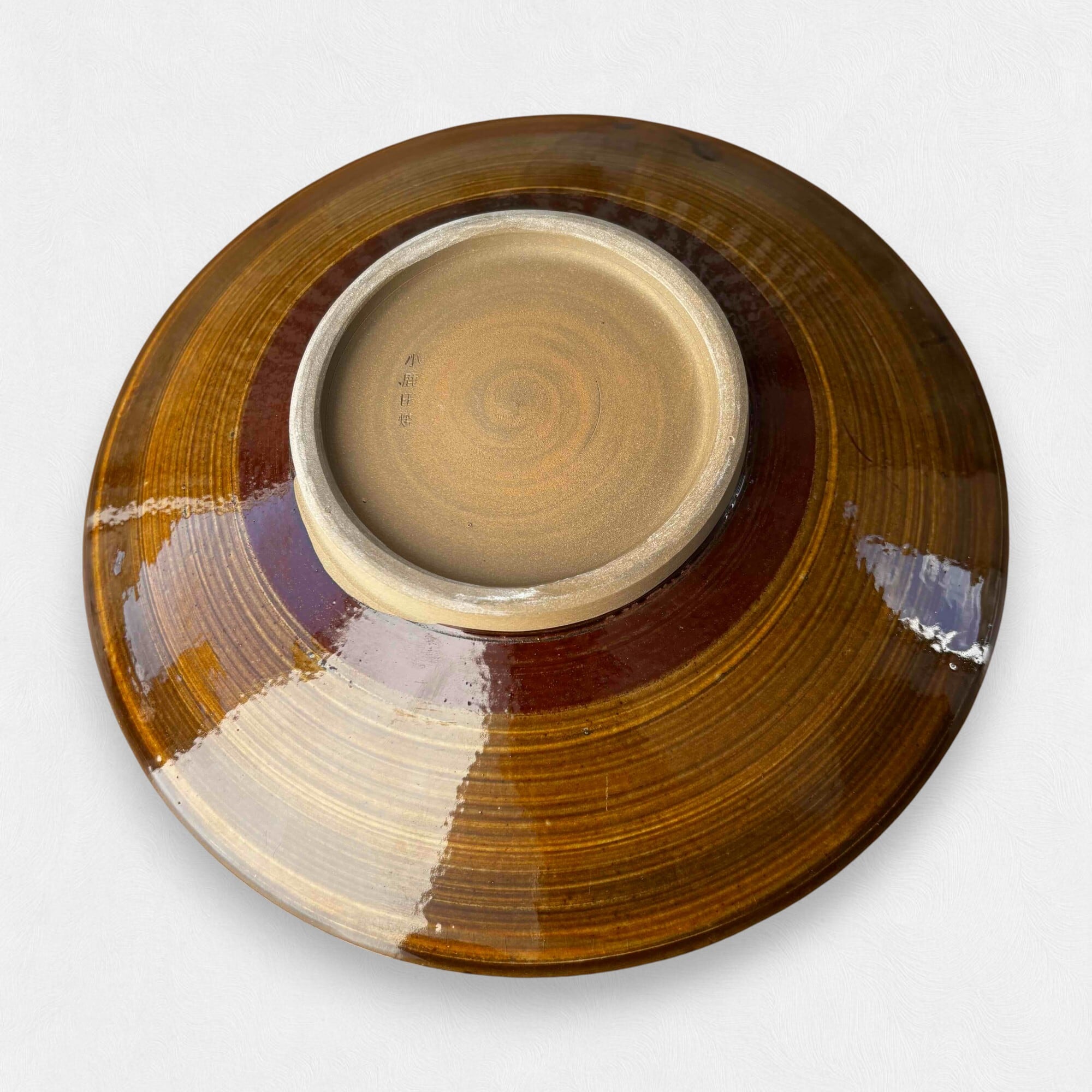 小鹿田焼の多くは窯に入れる際、何枚か重ねて焼くため真ん中に「蛇の目」という輪が残りますが、こちらは一番上で焼かれている「目なし」です。