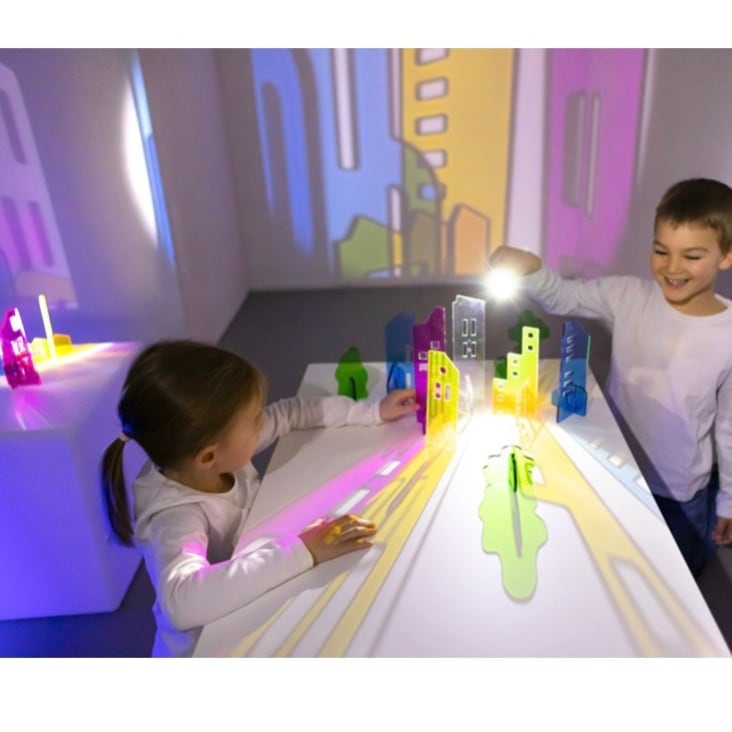 【光の街】アクリルの街は光を通すことで、色とりどりの色の影を作ることができ、異なるパーツを想像力豊かに組み合わせて、オリジナルの建物や植物を作ることができます。