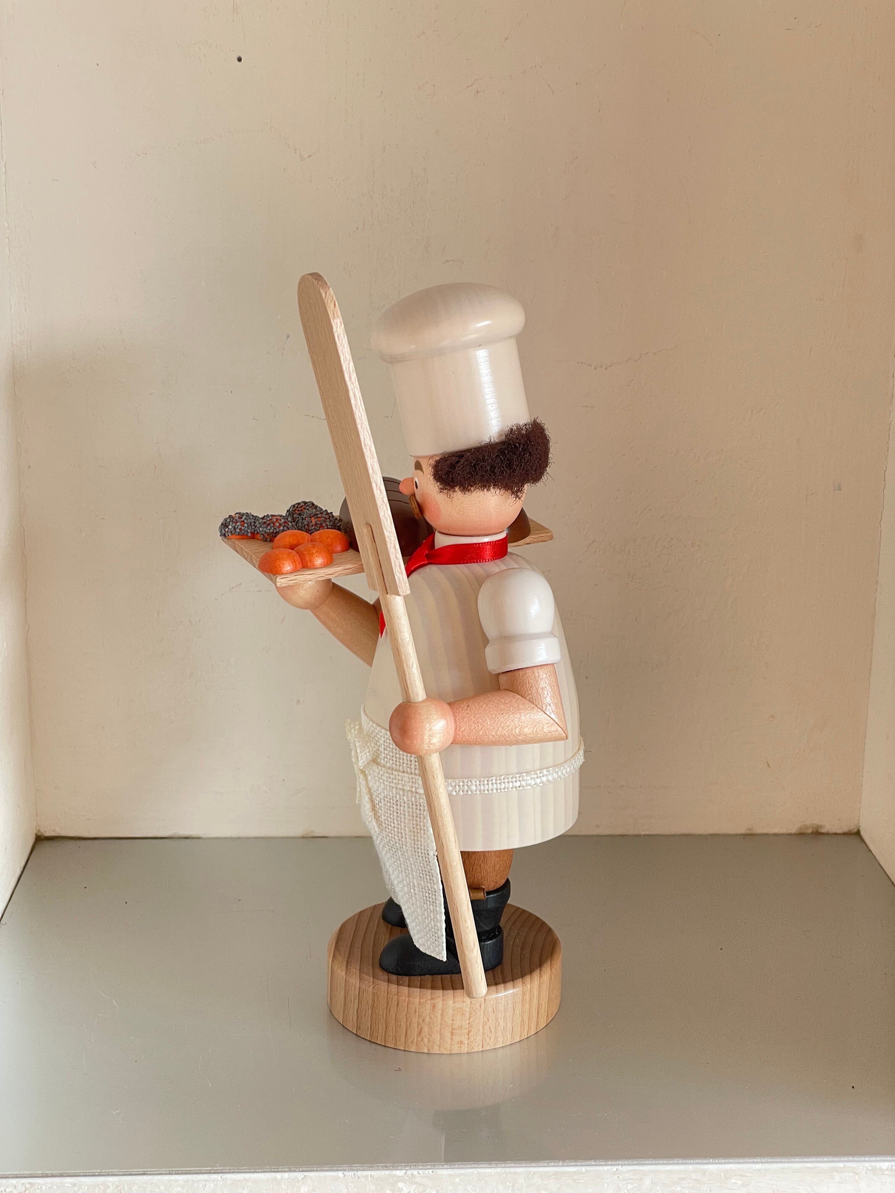 木製クラフト玩具の産地で名高いエルツ地方の煙出し人形。人形の胴体の空洞部分でお香を焚くとパンの横からお香の煙がまるで湯気のようにたちのぼります。パン屋さんの装飾としてもおすすめです。