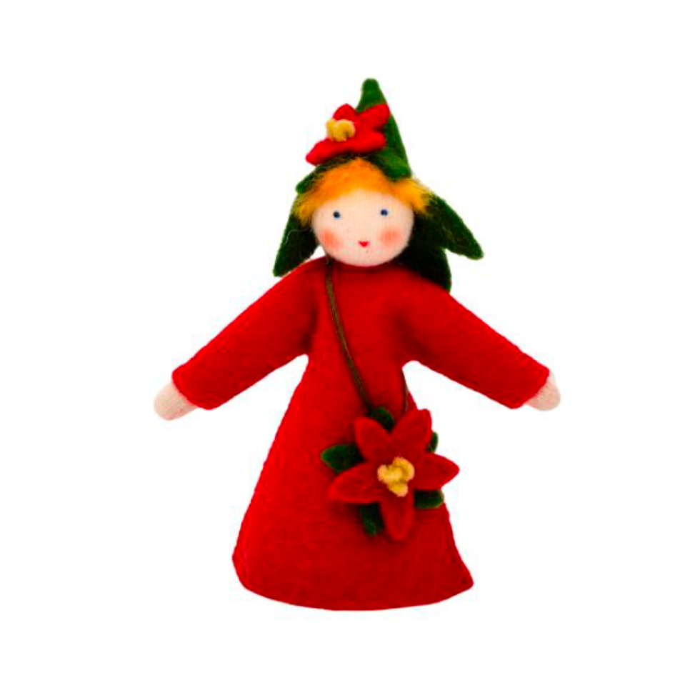 真っ赤なドレスに緑の葉っぱの帽子、クリスマスにぴったりなポインセチアの妖精(Largeタイプ)です。花のポシェットももちろん手作り、細部までこだわって作られているのがわかります。