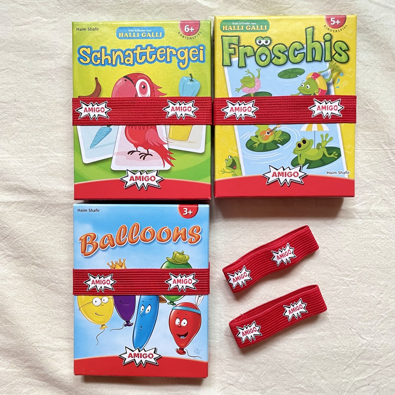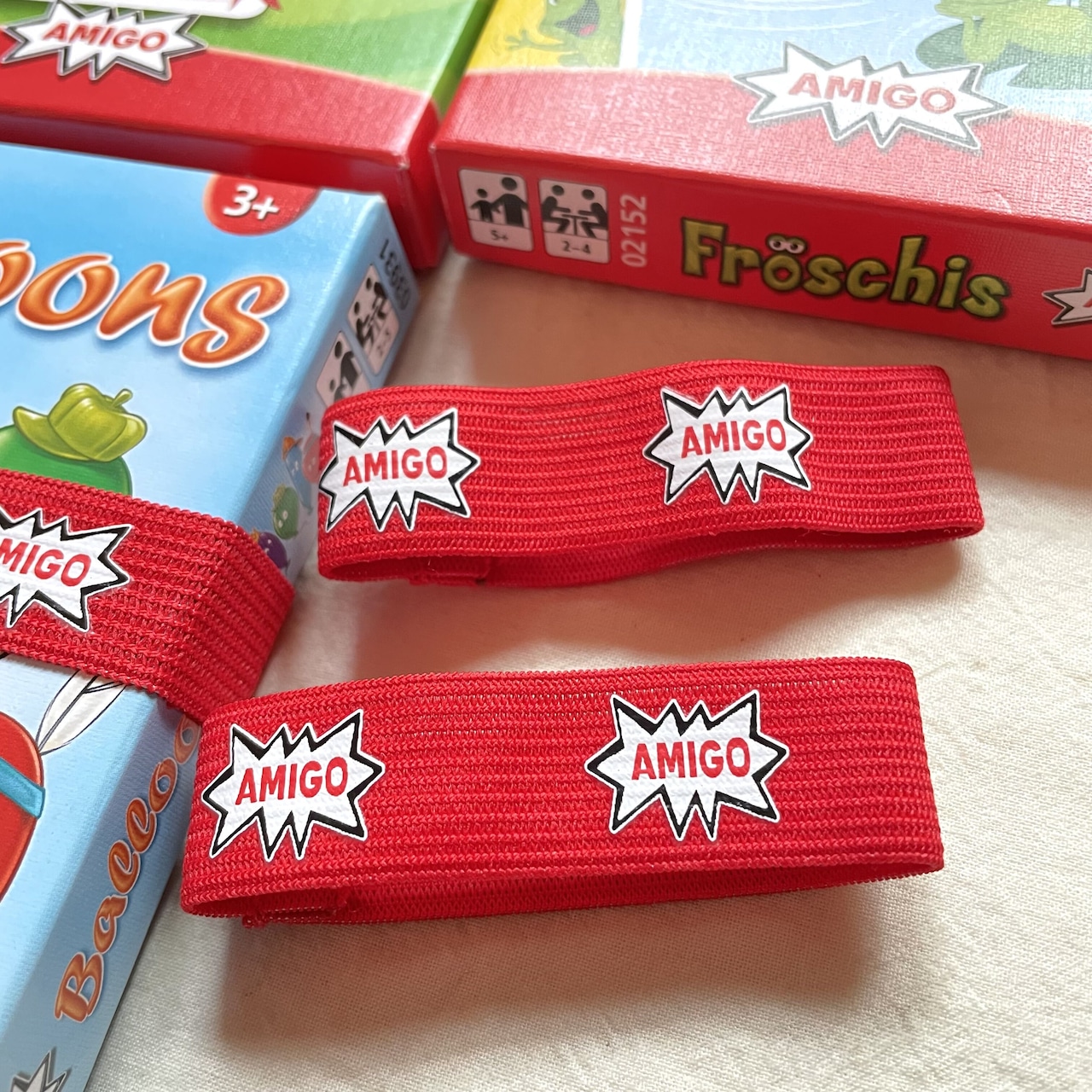 赤いゴムバンドにアミーゴ社のロゴが入っています。
