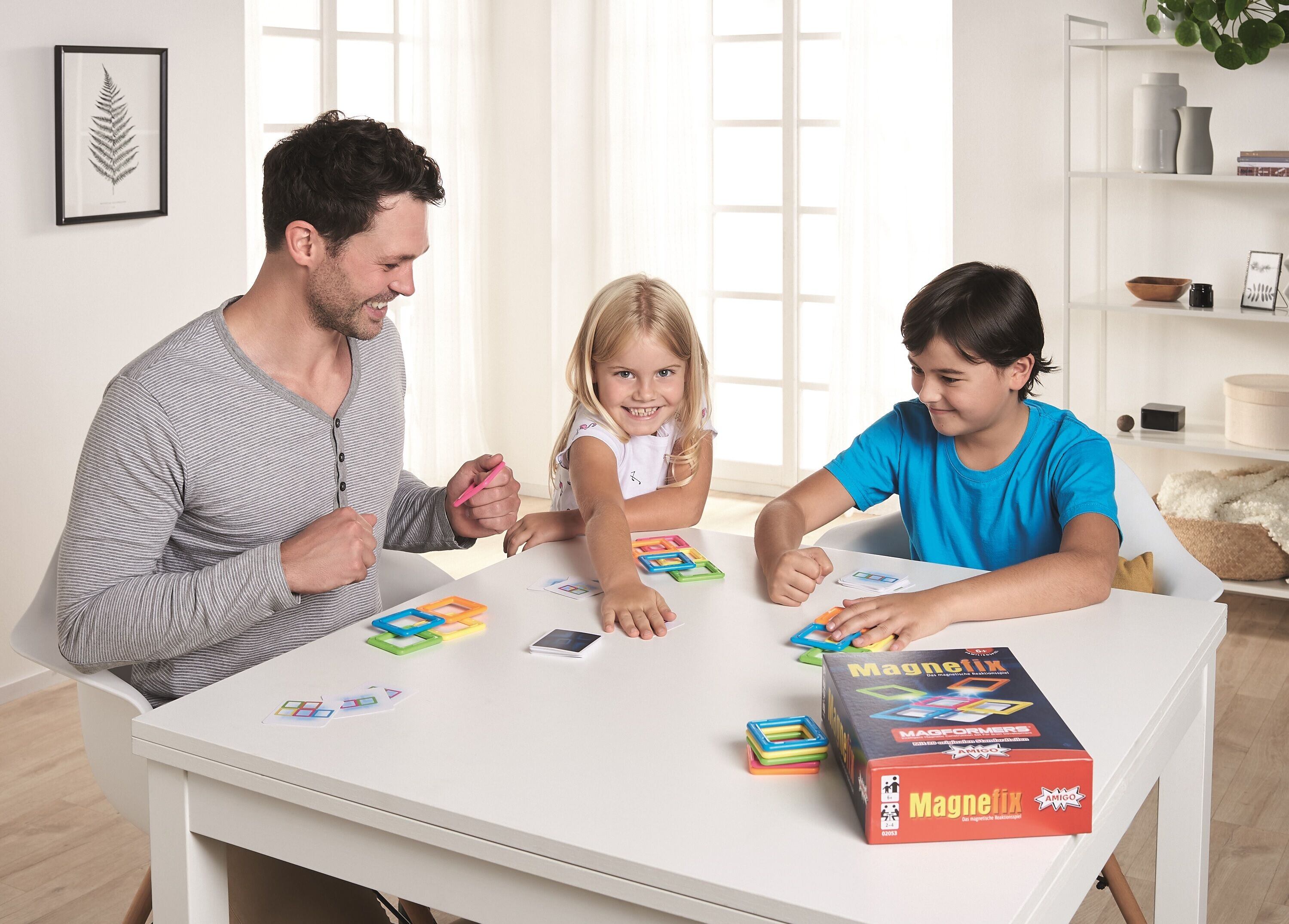 手元にある6種類のフレーム、「スタート」の合図で一斉に課題カードと同じ形状にフレームを組み立てます。いち早くできた人は、課題カードにタッチ!