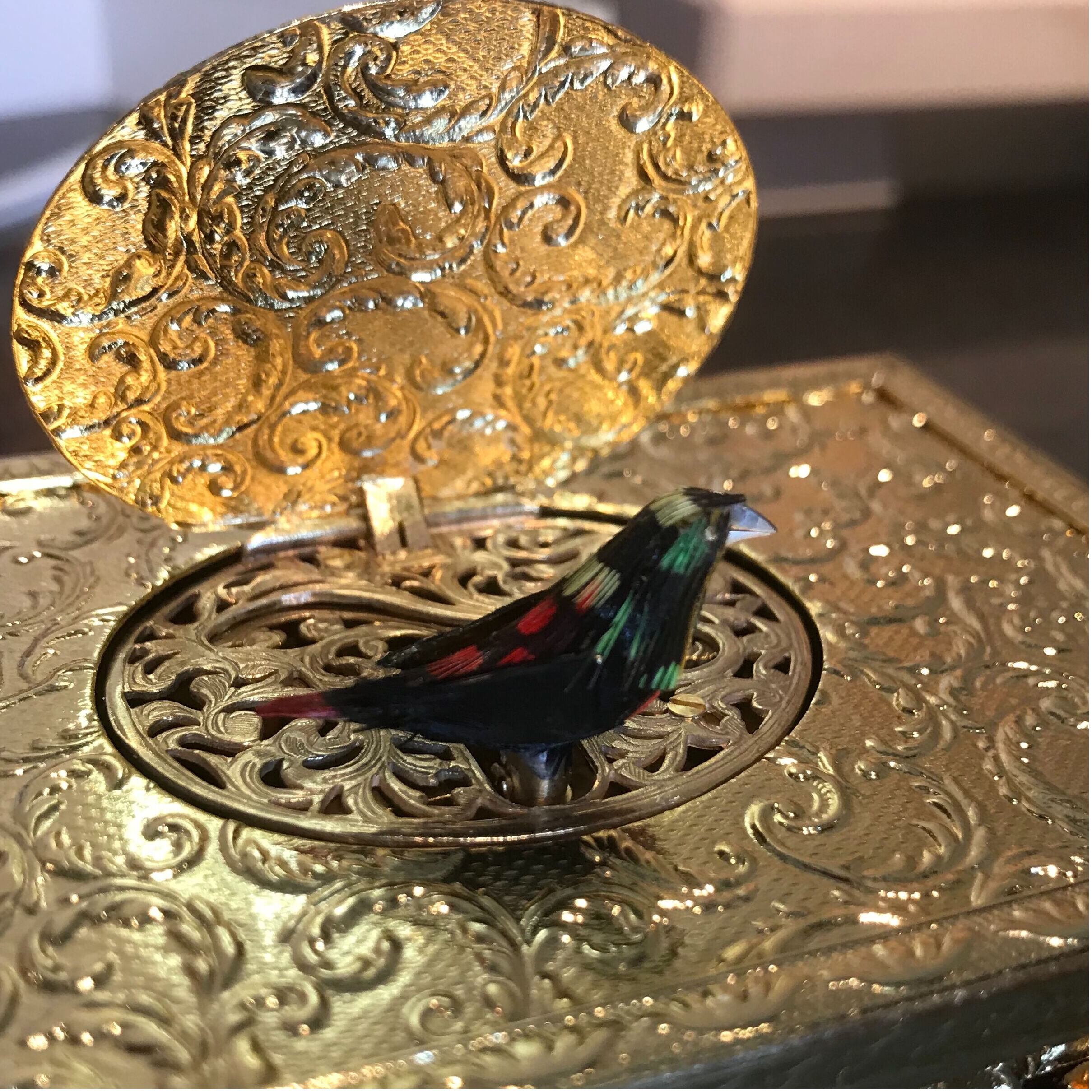 箱手前のレバーを動かすと、箱上のふたが開き、小鳥が出てきて、くちばしを動かし、羽根をはばたかせ、体の向きを変えて動き、首を振ります。15秒ほど、鳴いた後、また、箱の中に入り、ふたをとじます。全ての動きは、ぜんまいの力により動かされており、小鳥の羽も本物の羽根を使い、また、鳴声も、昔と同じ、木と革で作られたフイゴ/フエで出来ています。この全ての部品、動きがこの11cmという小さな箱の中に収められています。