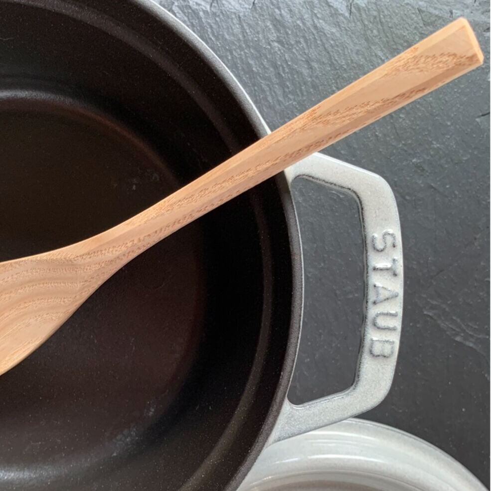 混ぜたりひっくり返したりするのに重宝するだけでなく、匙のように少し救えるので煮汁をかけたりも。利き手も関係なく、幅が狭いことで小回りが利くので、ついつい出番が多くなってしまいます。