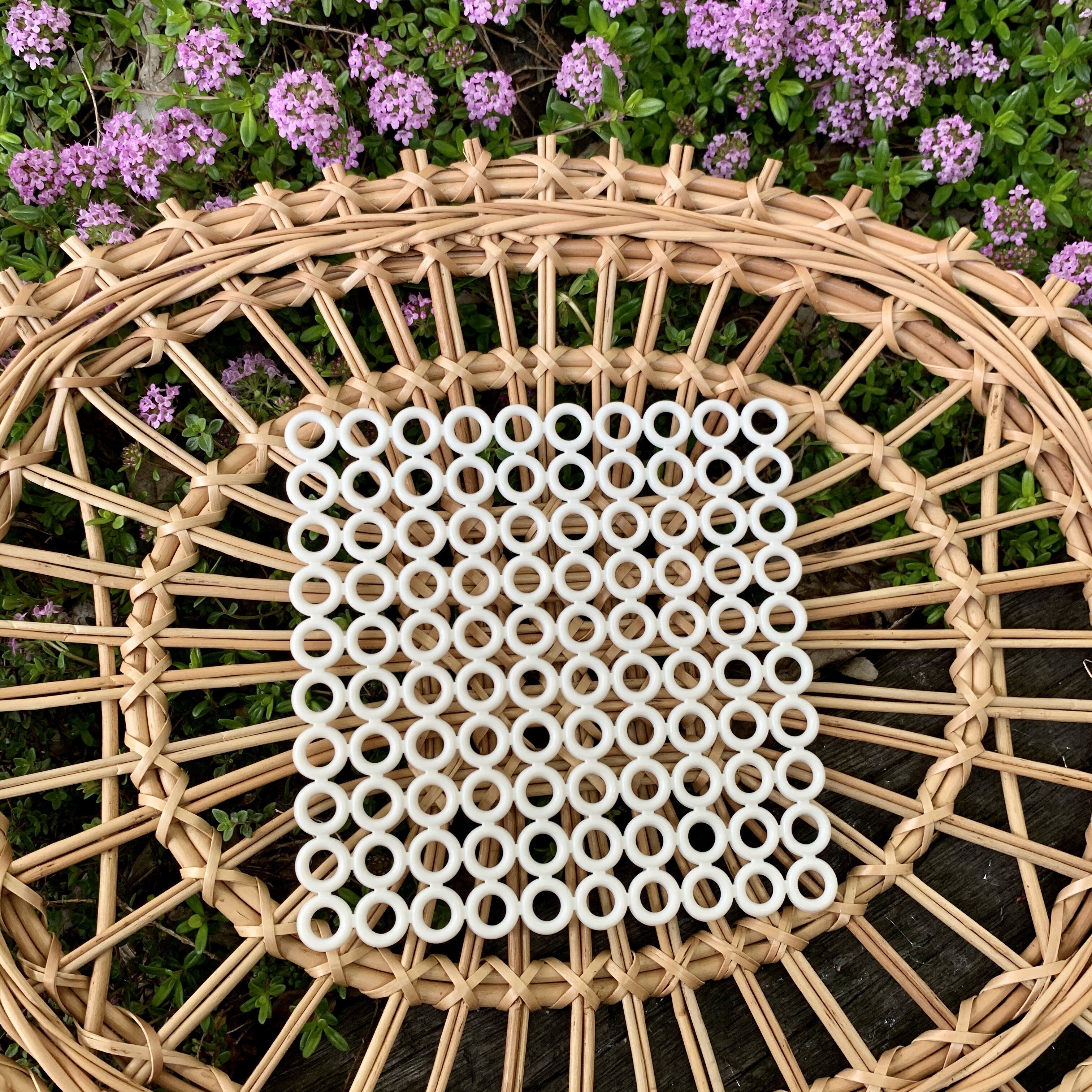 柔らかいプレートの上にボタン状のパーツをはめて模様をつくります。はめ込む時のプチプチという感触が心地よくて、ついついハマってしまいます。パーツがプレートに固定されるので作品が壊れてしまうことなく、出来上がった作品を壁にかけたり、吊るしたりして飾ることもできます。パーツをプレートからはずすのも簡単なので、繰り返し遊ぶこともできます。
