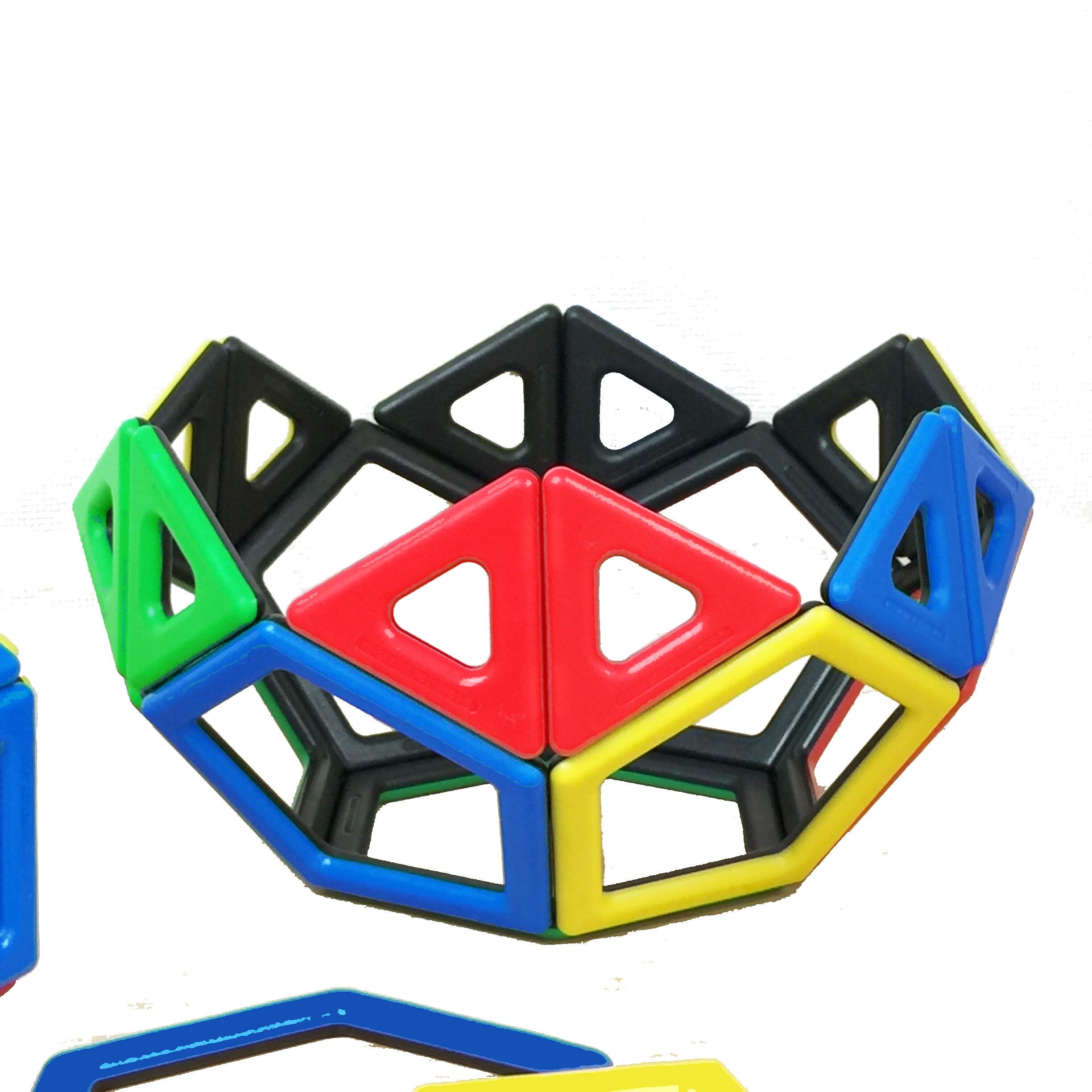 色の面(表)同士、また黒色の面(裏)同士が引き合って磁石の面白さを楽しみながら構成あそび、小さいお子さんから楽しめます。偶然にできた形やその変化に気づきながら、少しずつ平面から立体物の構成へと遊びも広がっていくでしょう。マグネットボードに並べて、モザイク遊びを楽しむこともできます。