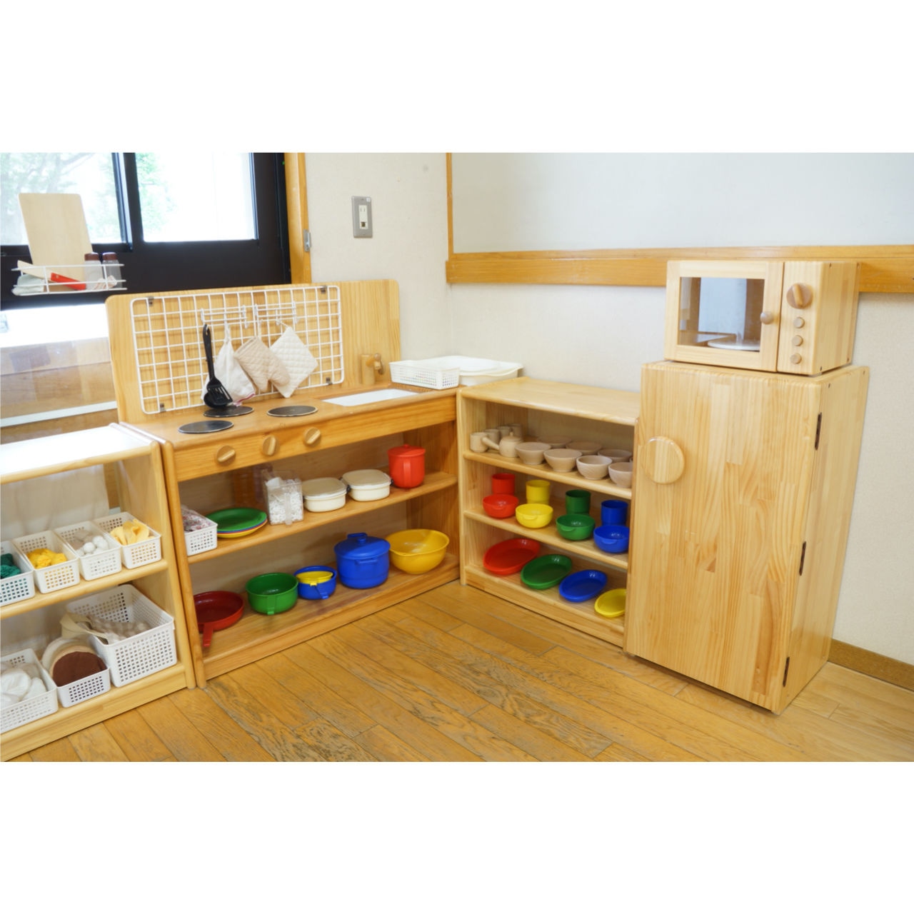 電子レンジは、今やどこの家庭にもあると言っていいと思います。子供の生活の中に当たり前にあるだけに、ままごと遊びの中でもしっかり活躍してくれるアイテムです。扉はアクリル板を使用、ツマミも回転します。