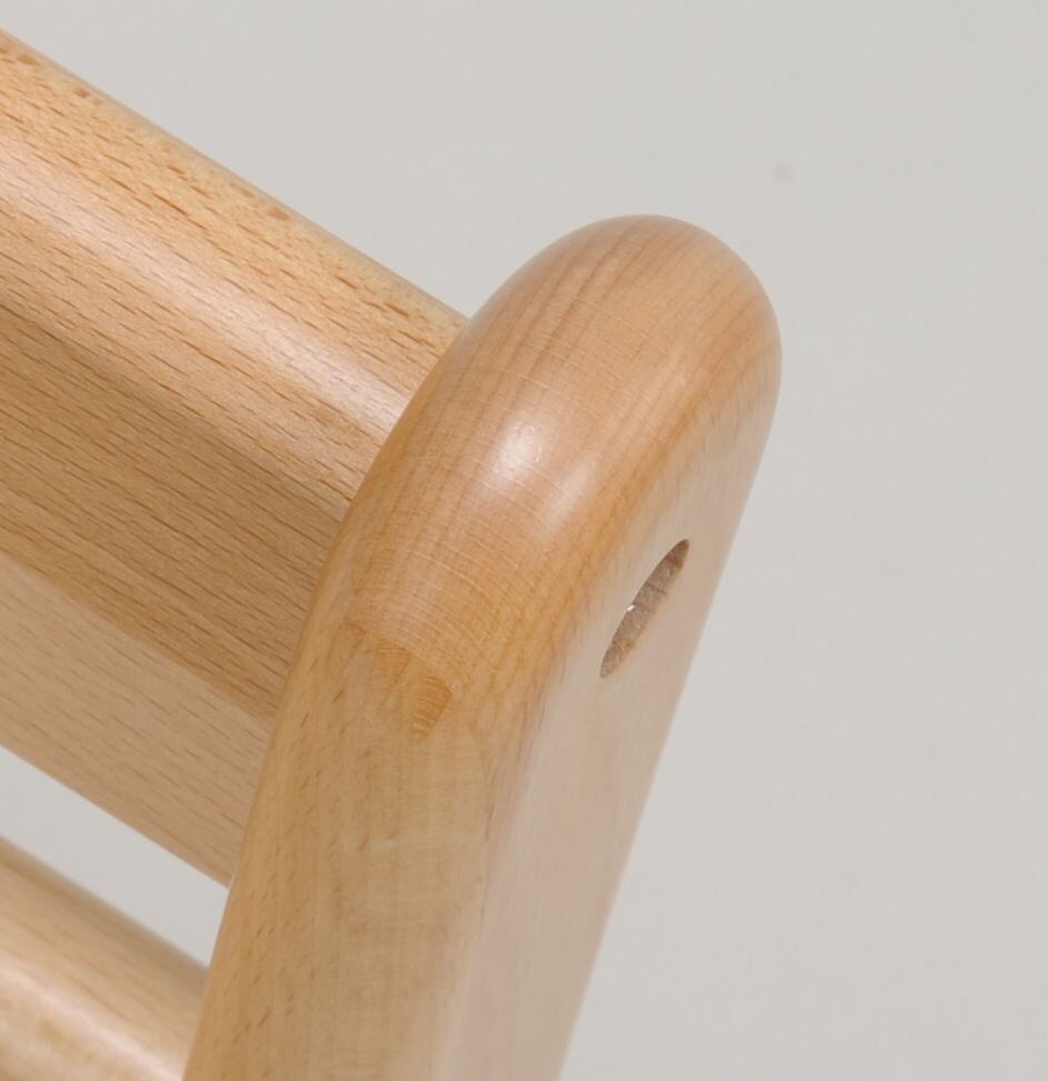椅子の足底にはオリジナルのパットがついていて、床を傷つけない配慮がされています。背もたれの角部分の面取り加工も一点ずつ手作業仕上げ、子どもが使うことを第一に丁寧に作られています。