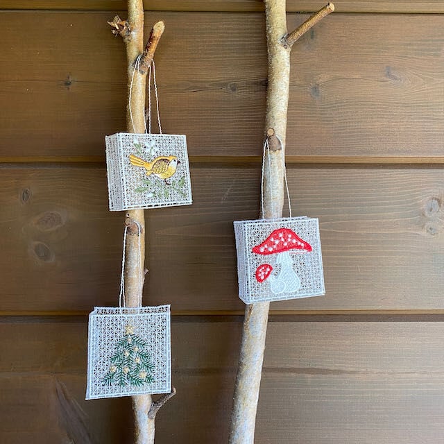 こちらはレースバックのオーナメント、柄は、小鳥・きのこ・ツリーの3種類です。 小さいながらもしっかりまちも付いているので、中に小さな贈り物を入れることもできます。