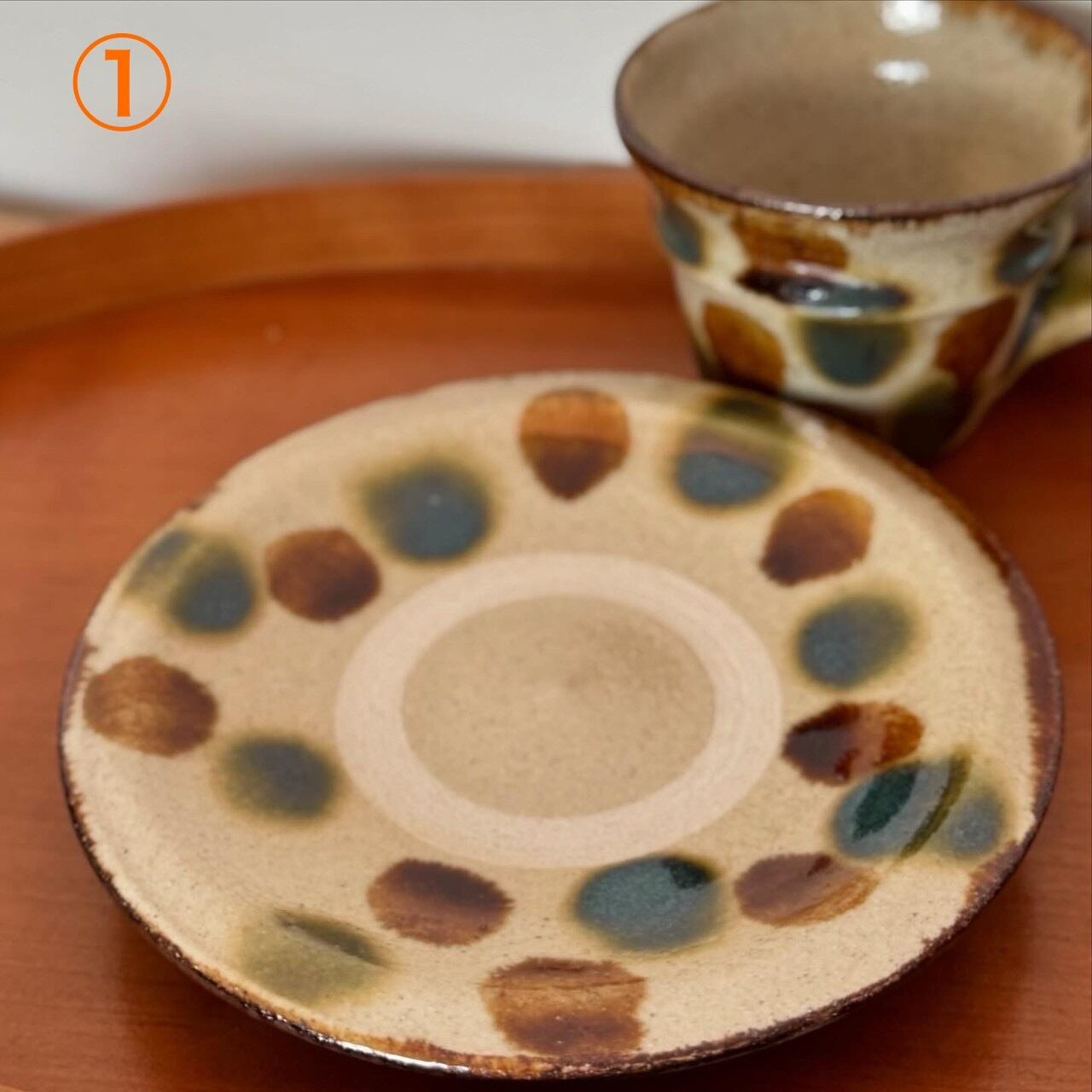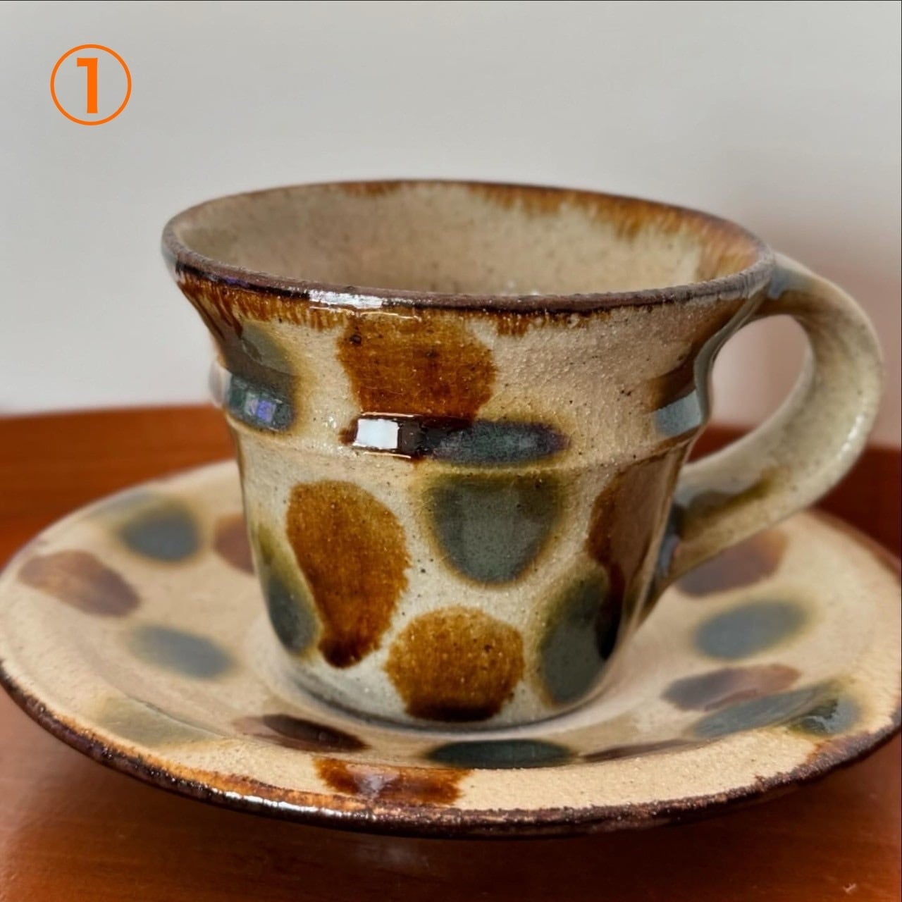 茶と緑の水玉模様が美しいコーヒーカップとソーサーのセットです。